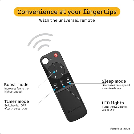 - CEILING FAN WITH SMART REMOTE: Adjust fan’s speed, set timer of 2, 4, 6, 8 hrs, switch on/off, and activate boost mode – from anywhere within 15 feet. Say goodbye to conventional regulators and hello to the convenience of remote.